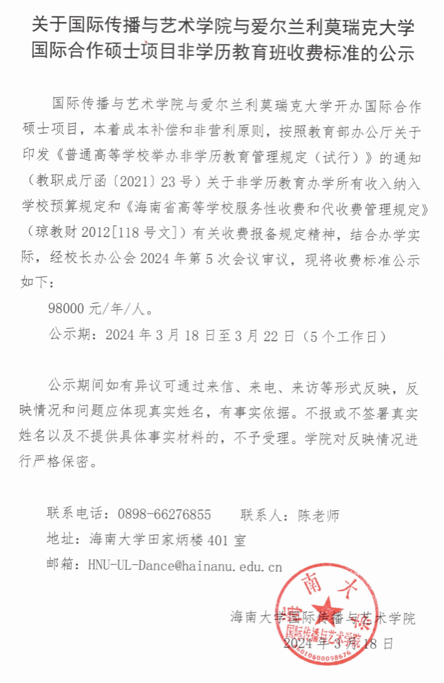 关于公司与爱尔兰利莫瑞克大学国际合作硕士项目非学历教育班收费标准的公示