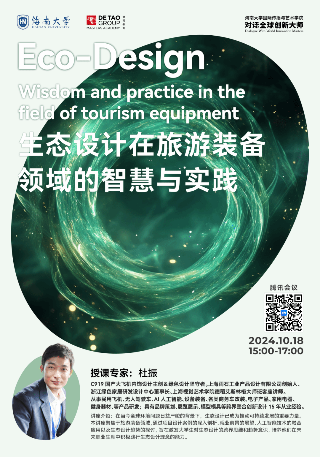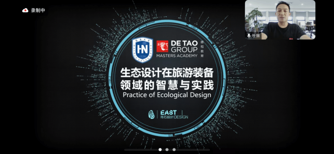 10月18日15:00,2024“对话全球创新大师讲座”《生态设计在旅游装备领域的智慧与实践》在线上举行,由上海雨石工业产品设计有限公司创始人杜振主讲,设计系专业教师方星星博士担任学术主持,线上线下近百名师生同时参与。