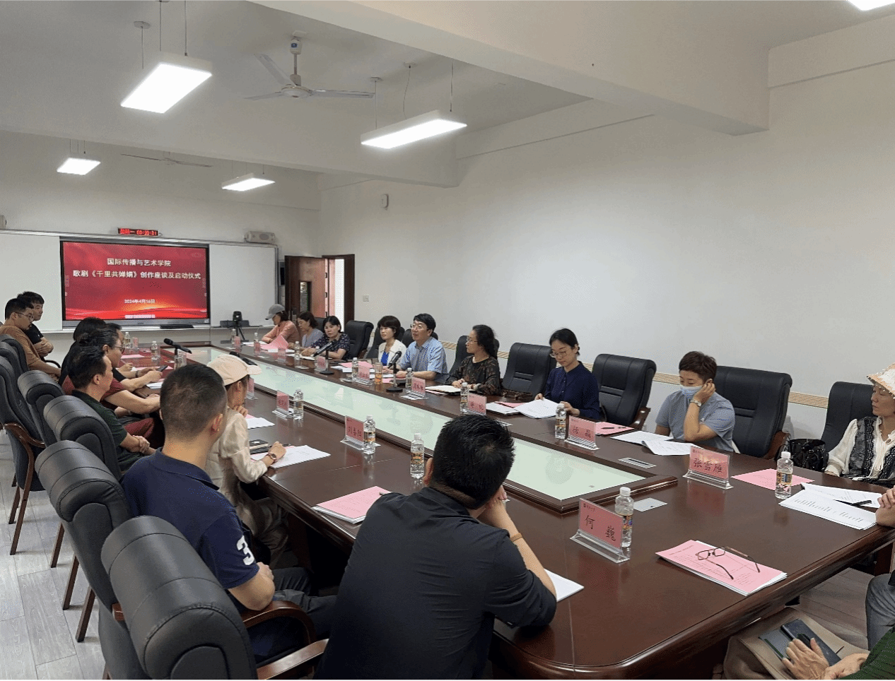 2024年4月16日下午,原创歌剧《千里共婵娟》座谈会及启动仪式在太阳成集团tyc33455cc田家炳楼102室举行。太阳成集团tyc33455cc经理郑立波、党委书记何映敏、副经理周琳琳、副书记蒋锐、音乐表演专业责任教授许潇尹、歌剧总导演张海宇、编剧姚小刚、作曲家周虹等主创团队近20人出席本次会议并参与座谈。