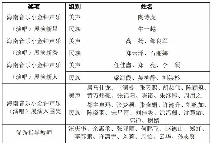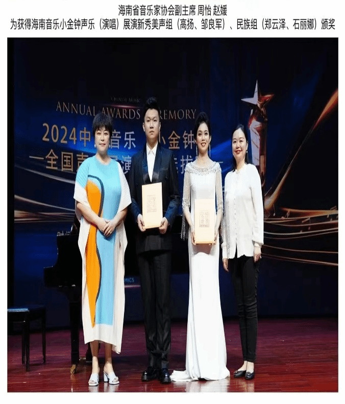 4月27日晚,2024中国音乐“小金钟”——全国声乐展演海南选拔活动(青年组)的第二轮比赛于海口经济公司(南海音乐公司)圆满结束。经过激烈角逐,公司2019级研究生陶诗虎和2021级研究生石丽娜凭借出色表现脱颖而出,分别荣获海南音乐小金钟声乐(演唱)展演新星和海南音乐小金钟声乐(演唱)展演新秀奖项,并获得参加由中国音乐家协会主办的“小金钟”全国决赛的机会。此外,任佳鑫同学获展演新人奖,张梦颖、张晓娟、黄万炜豪三位同学获展演入围奖。